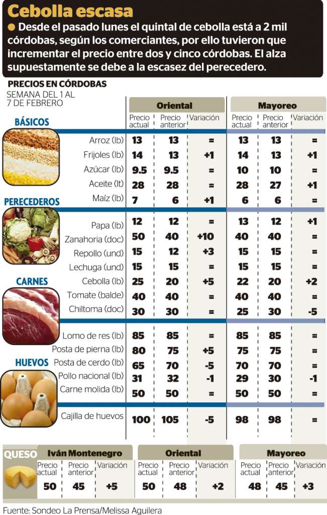 En el transcurso de la semana pasada el precio de la libra de cebolla registró un alza entre dos y cinco córdobas. En el mercado de Mayoreo pasó de 20 a 22 córdobas, mientras que en el Oriental de 20 a 25.