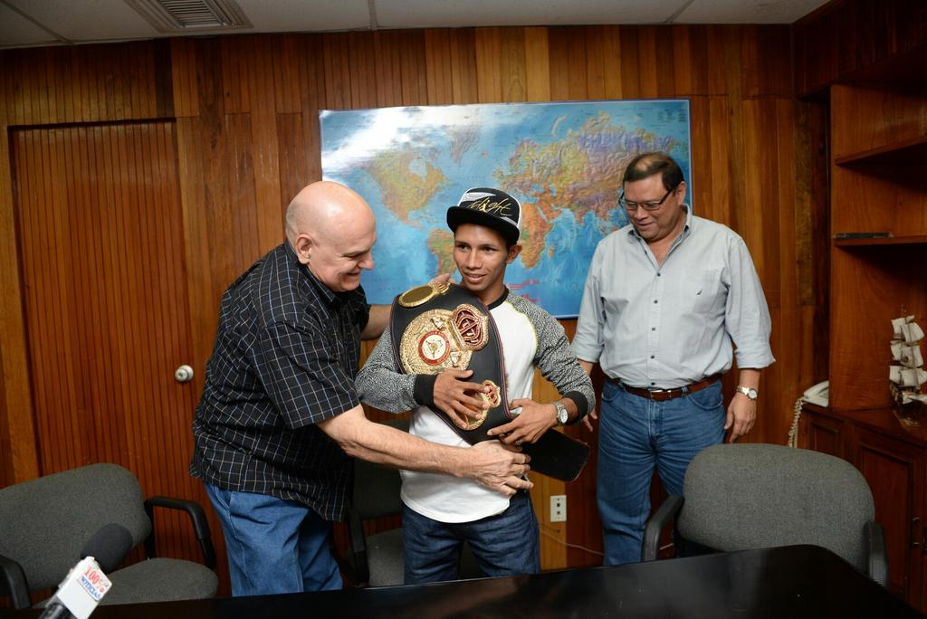 El vicepresidente de la Asociación Mundial de Boxeo entregó este 23 de marzo el título de campeón de las 105 libras a Byron “El Gallito” Rojas, quien el sábado consiguió convertirse en el duodécimo campeón mundial de Nicaragua al derrotar al sudafricano Hekkie Budler por decisión unánime.