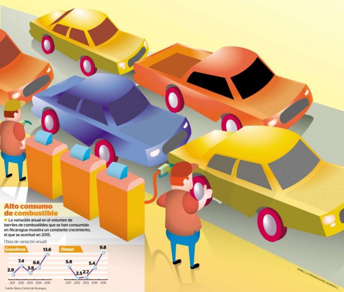 En 2014 los nicaragüenses consumieron 3.85 millones de barriles de diesel, mientras que el año pasado fueron 4.23 millones de barriles, un despunte de 9.8 por ciento; el consumo de gasolina pasó de 2.27 millones de barriles en 2014 a 2.58 millones de barriles de consumo en 2015, lo que significó un incremento de 13.6 por ciento.