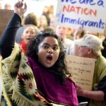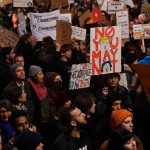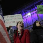 Una mujer grita junto a otros manifestantes en el aeropuerto internacional de San Francisco, California. LAPRENSA/AFP
