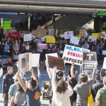 Manifestantes se reunieron en la terminal Tom Bradley del aeropuerto internacional de Los Ángeles, California, para manifestarse en contra de la orden ejecutiva del presidente Trump. LAPRENSA/AFP