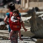 Una niña iraquí carga un bebé durante un desplazamiento en el oeste de Mosul tras una ofensiva militar de las fuerzas del gobierno al Estado Islámico. LA PRENSA/AFP