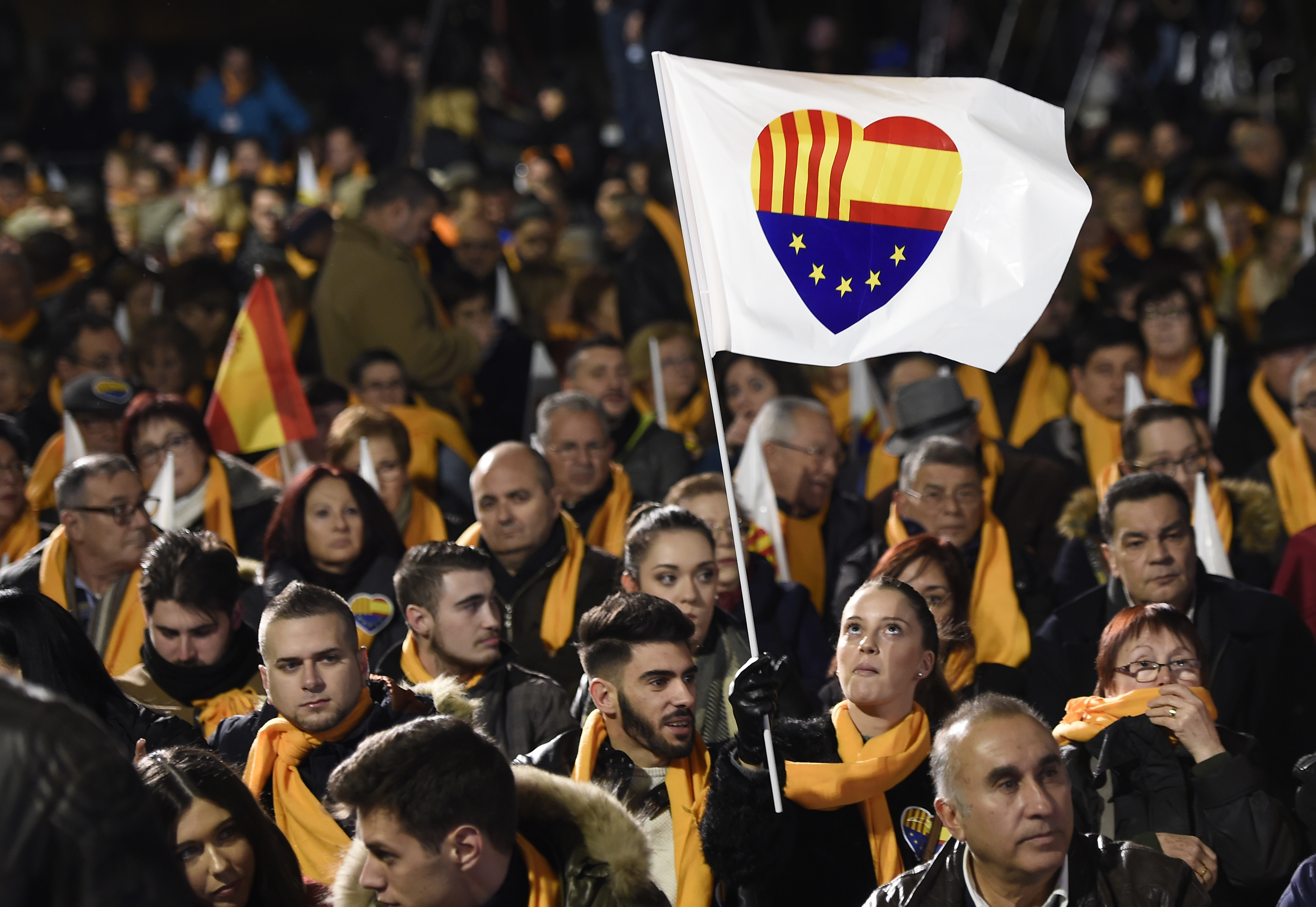 People wait for the start of the center-right party Ciudadanos (Citizens) final campaign meeting for the upcoming Catalan regional election on December 19, 2017 in Barcelona. Catalan voters will decide on December 21 whether to return the separatists to power or to bring in a pro-unity government, as their region’s independence crisis nears its moment of truth. / AFP PHOTO / Josep LAGO