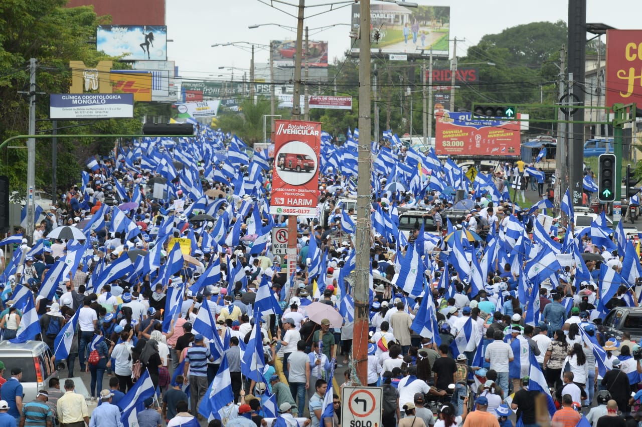 Miles de nicaragüenses marcharon este jueves bajo el lema «Juntos somos un volcán» para exigirle a Daniel Ortega y Rosario Murillo su salida inmediata del poder y la investigación y enculpamiento de los más de 350 asesinados durante la represión a las protestas pacíficas.