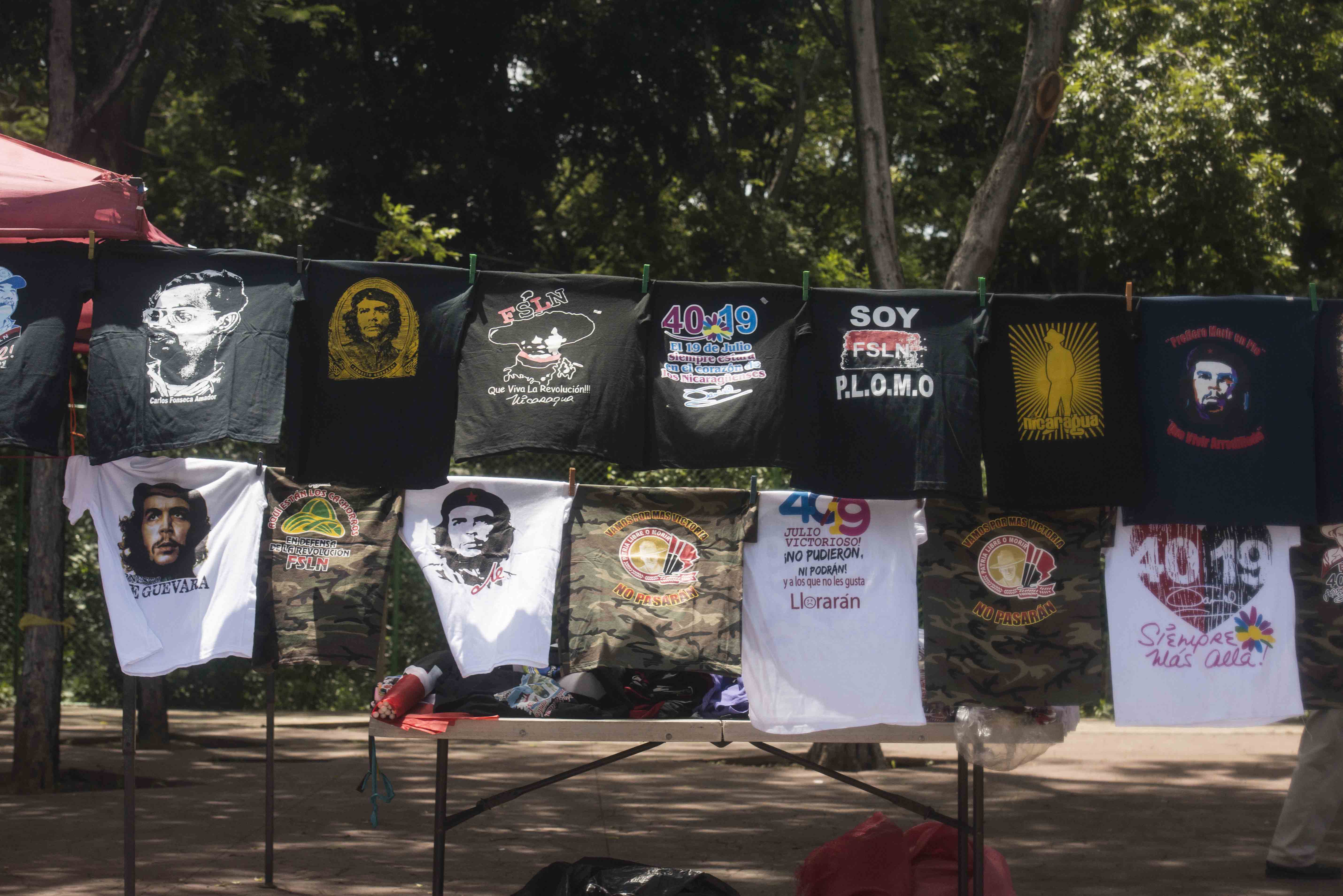 “Soy FSLN. P.L.O.M.O”, “Sepan los nacidos y los que van a nacer, nacimos para vencer no para ser vencidos”, “Plomo. Venceremos”, son algunos de los mensajes impresos en las camisetas que se ofrecían desde tempranas horas de este jueves en esas zonas.