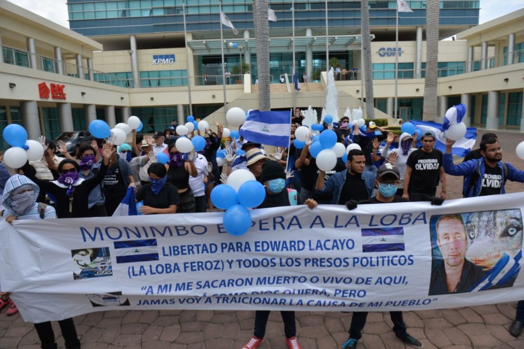 12:35 p.m. Los manifestantes portan una manta con el nombre del preso político Edwar Enrique Lacayo Rodríguez, conocido como “La Loba”, y exigen su liberación.
