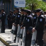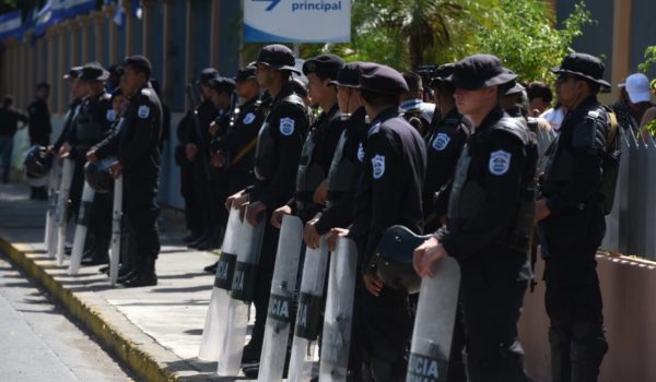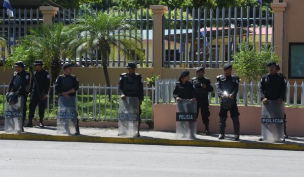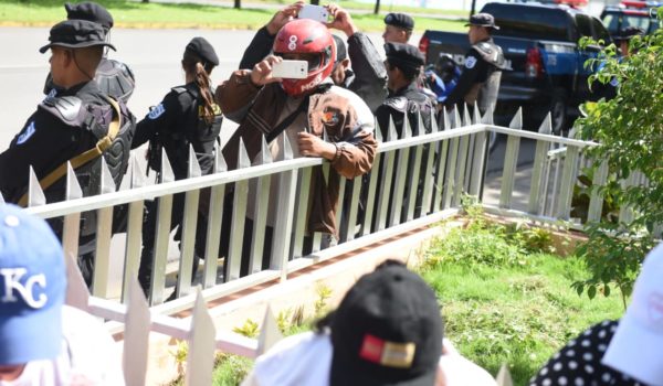 Mientras las madres de los presos políticos exigían la libertad de sus hijos, docenas de agentes antidisturbios de la Policía y paramilitares orteguistas las rodearon y fotografiaron. LA PRENSA/R. FONSECA