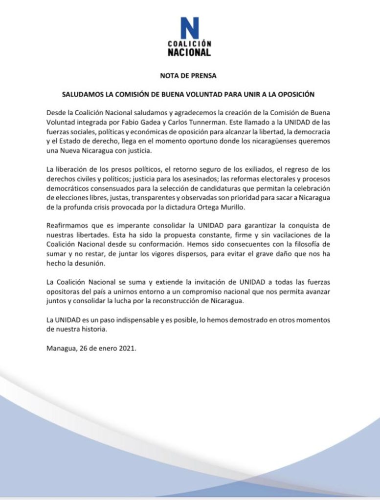 «La Coalición Nacional se suma y extiende la invitación de unidad a todas las fuerzas opositoras del país a unirnos entorno a un compromiso nacional que nos permita avanzar juntos y consolidar la lucha por la reconstrucción de Nicaragua», manifestó la CN en un comunicado emitido minutos después del anuncio de la iniciativa.