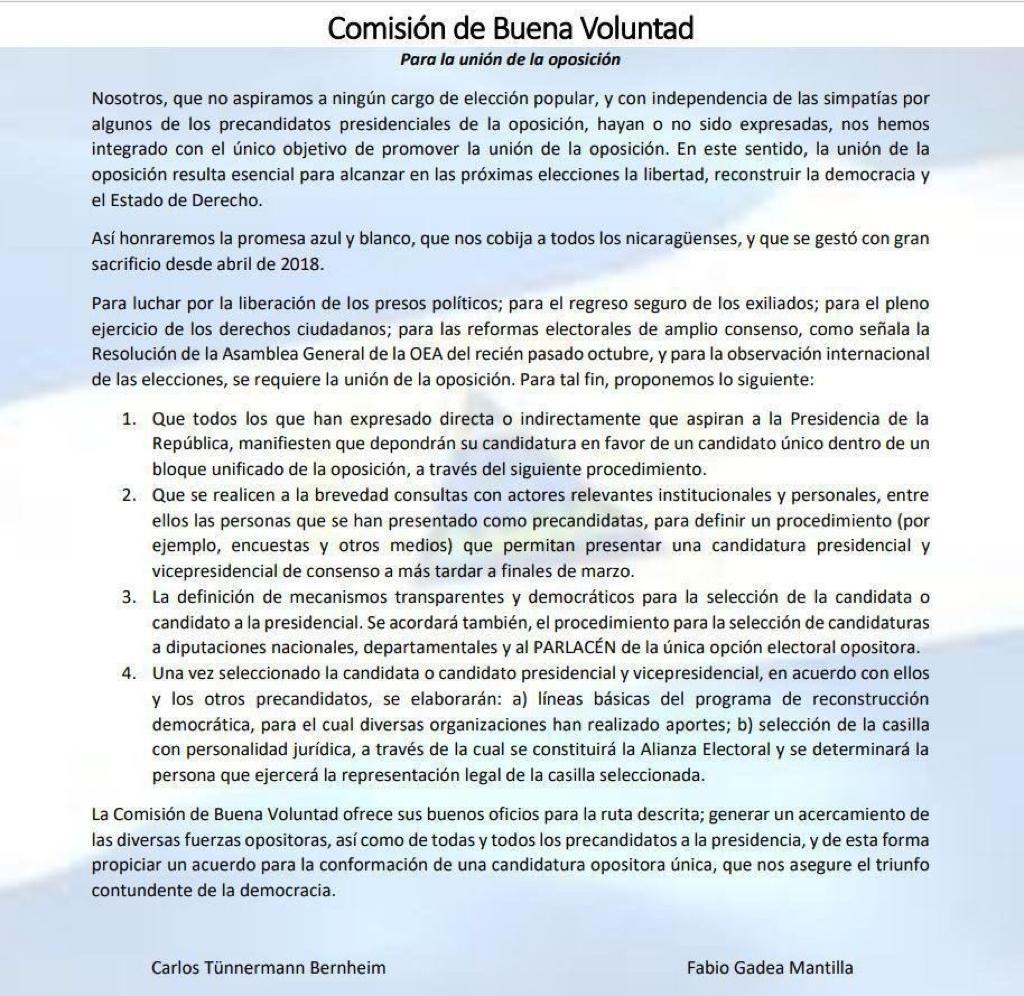 La «Comisión de buena voluntad» está encabezada por dos voceros, Carlos Tünnermann Bernheim y Fabio Gadea Mantilla, y «tiene como objetivo fundamental promover la unión de la oposición», manifestaron este martes en un comunicado leído en su primera conferencia virtual, para anunciar la iniciativa.