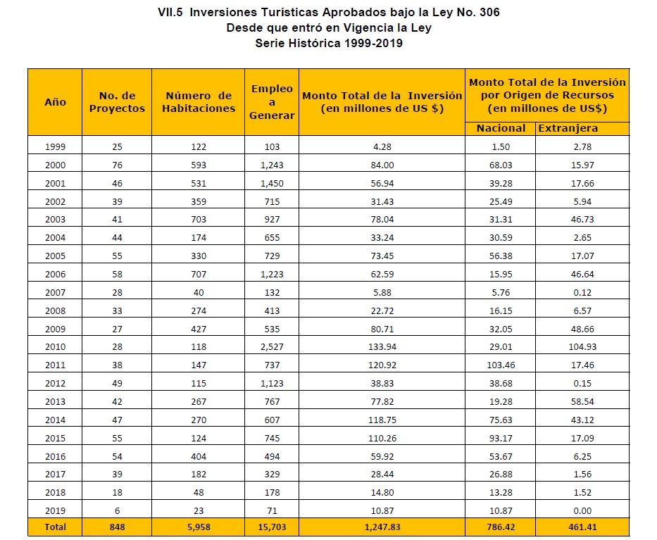 El 2010 fue el mejor año para la inversión turística, por medio de la Ley 306, porque en esa fecha se logró 133.94 millones de dólares, esto representó una generación de 2,527 empleo. De esa cantidad de dinero, 104.93 millones eran de inversionistas extranjeros, y la diferencia de los 29.01 millones era capital nacional.