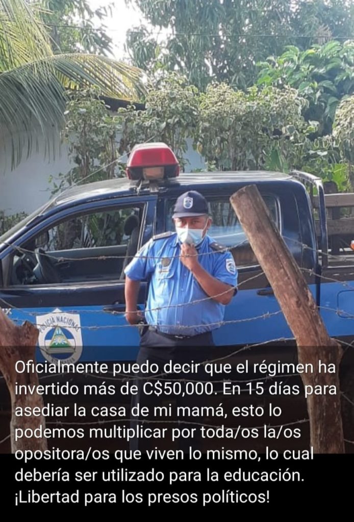 Al igual que otros opositores al régimen de Daniel Ortega, López, critica como la dictadura malgasta los recursos públicos para perseguirlos y asediarlos las 24 horas del día. López contabiliza que en al menos 15 días, la dictadura ha invertido más de 50 mil córdobas solo en asediar la vivienda de su mamá, pero no brindo más detalles de cómo desglosó ese cálculo.
