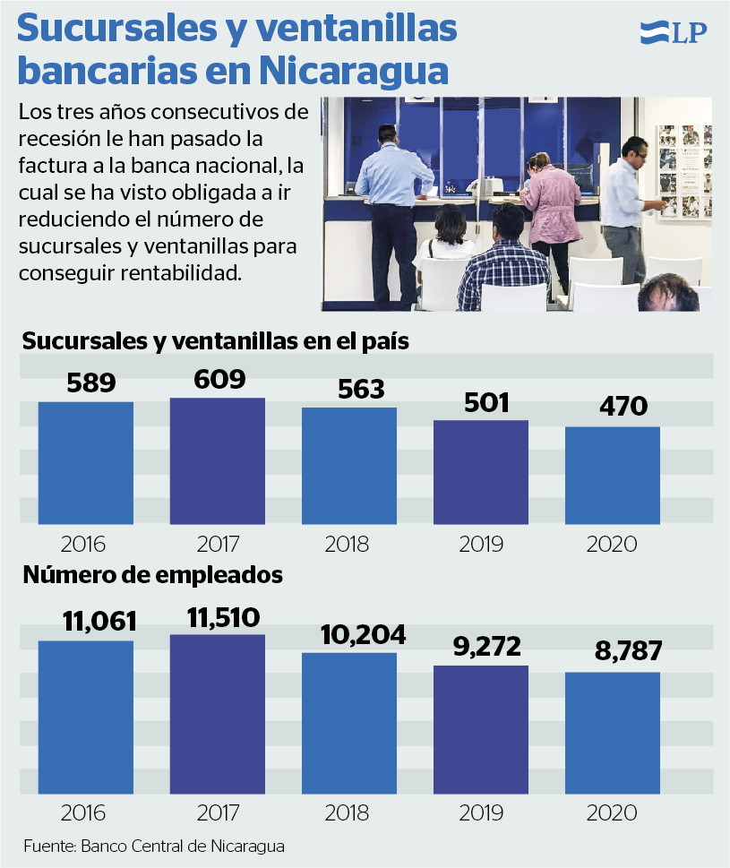 Sin embargo, hasta diciembre del 2020 se reportaron 470 sucursales, 199 de ellas en Managua y 271 en los departamentos, es decir que Managua ha perdido 68 centros y en el interior 74. Desde esa fecha hasta el año pasado el sector suprimió 2,697 plazas laborales.