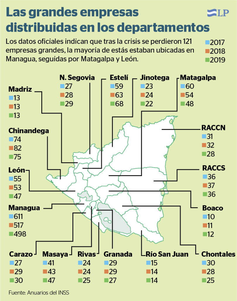 El anuario del INSS detalla que solo en Managua hasta el 2017 habían 611 empresas grandes, pero luego en el 2018 con el estallido social y las posteriores sanciones de Estados Unidos, se perdieron 94 empresas, y luego en el 2019 cerraron 19 empresas más. Cabe mencionar, no obstante, que este último año de referencia también hubo presión contra estas empresas por la decisión del régimen de Daniel Ortega de aplicar unas severas reformas a la Seguridad Social y la Ley de Concertación Tributaria, que aumentó la carga impositiva a este tipo de empresas. (Vea infografía).