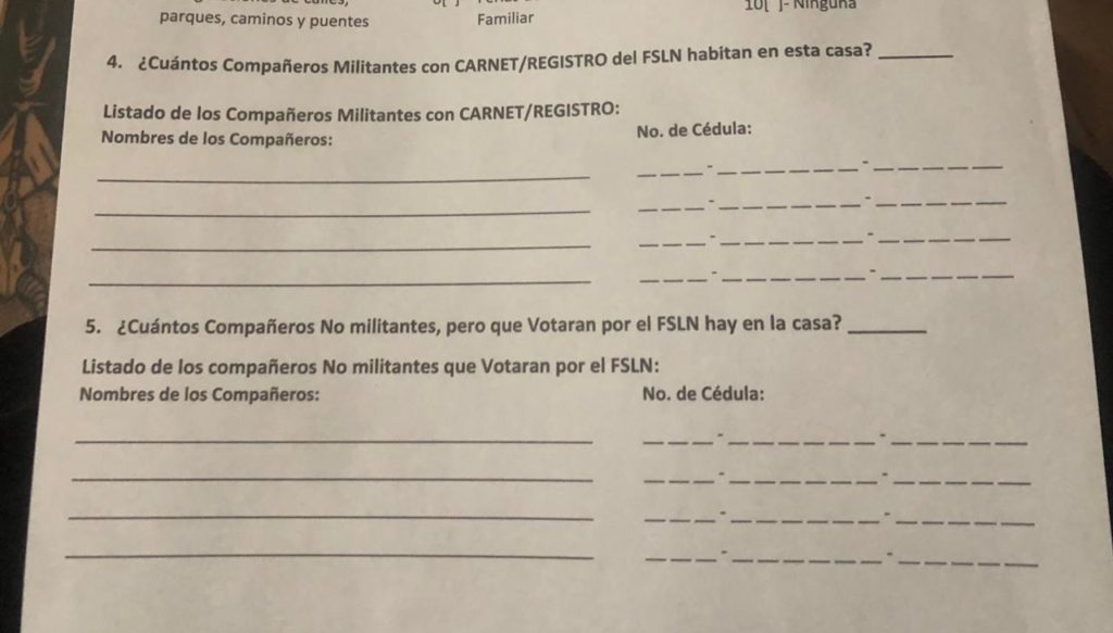 Estas “visitas”, los CPC —que son las estructuras partidarias del FSLN en las comunidades y barrios y están presentes en cada cuadra, así como cada comarca de las zonas rurales— las han realizado en elecciones anteriores. Sin embargo, este año, según los reportes ciudadanos, les dijeron que “no es un censo como el de años anteriores, sino que es más detallado y no solo se iban a limitar a preguntar si íbamos a votar por ellos (FSLN) o no”.