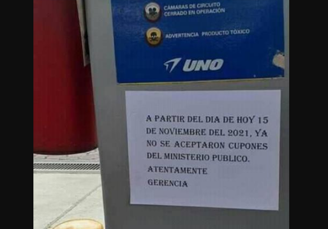 En algunas de estas estaciones aparecieron carteles en los que se lee: «A partir del día de hoy 15 de noviembre del 2021, ya no se aceptan cupones del Ministerio Público». La orientación es firmada por la gerencia.