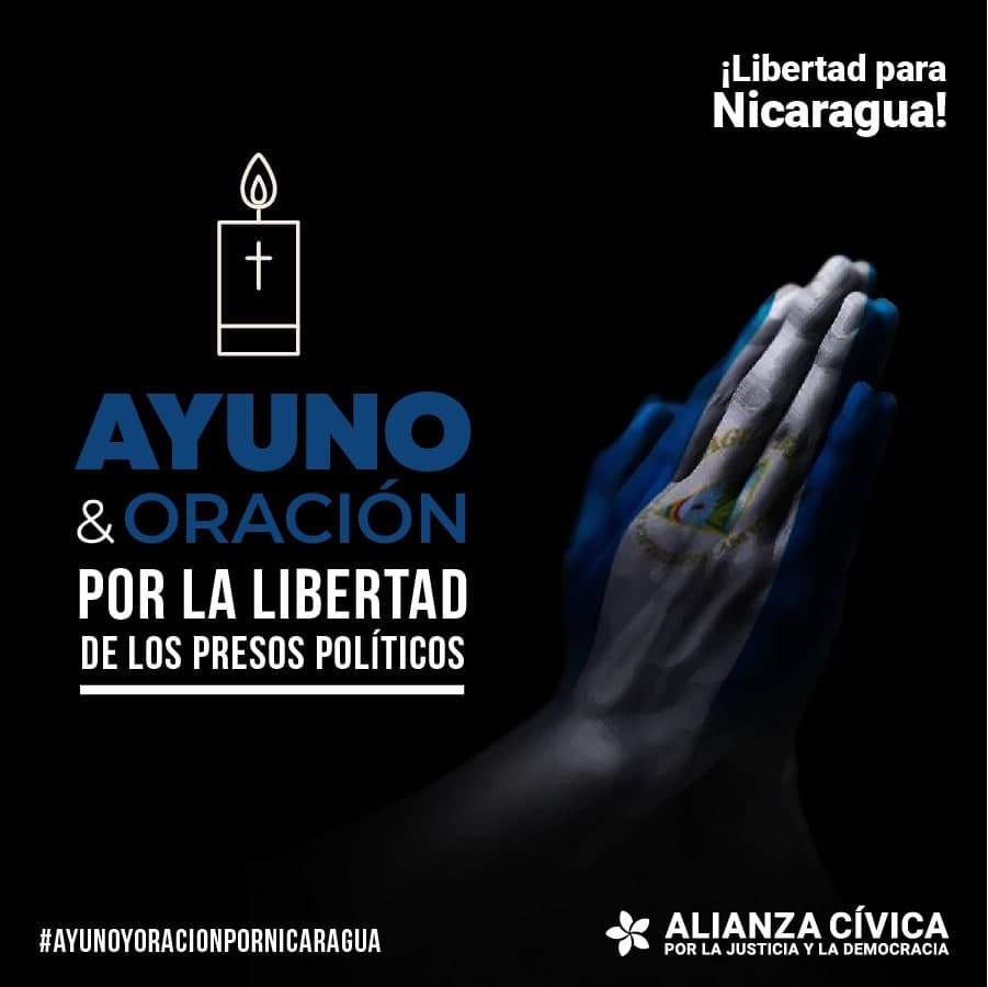 “Queremos invitarles para que este jueves 18 de noviembre nos acompañen en un día de ayuno y oración por las personas privadas de libertad de Nicaragua. Iniciamos a las 6:00 de la mañana y concluimos a la 1 de la tarde. Espero que se pueden sumar y en un mismo espíritu oremos por ellos, sus familias y por la libertad de Nicaragua” informó Berta Valle, esposa del líder político y precandidato presidencial Félix Maradiaga que fue detenido el 8 de junio y los acusan por el supuesto delito de conspiración para cometer menoscabo a la integridad nacional
