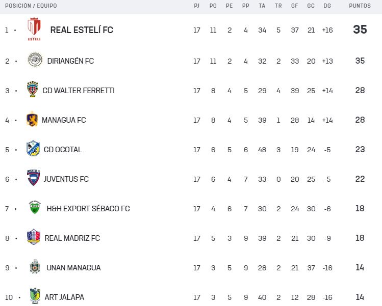 El líder podría cambiar y los cruces de la liguilla, que serán tercero vs. sexto y quinto vs. cuarto, dependiendo de los resultados entre Ocotal, que visita al Estelí, y Juventus, que recibe a la UNAN. Lo único fijo son las plazas tres y cuatro del Ferretti y Managua, que si acaso solo intercambian los lugares. De todas formas jugarán en casa el duelo decisivo.